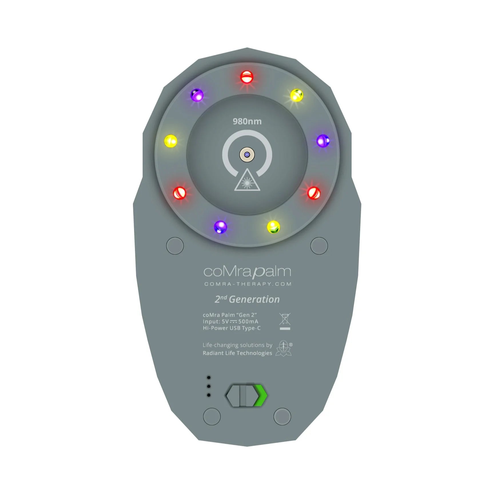 Like its predecessor, the Palm 2 coherently combines low-level laser, magnetism, and coloured LED light therapy in a single, easy-to-use device. These three therapies work together to support healing at the cellular level, restore balance, reduce inflammation, and energize the body’s natural ability to recover - without drugs or side effects.
